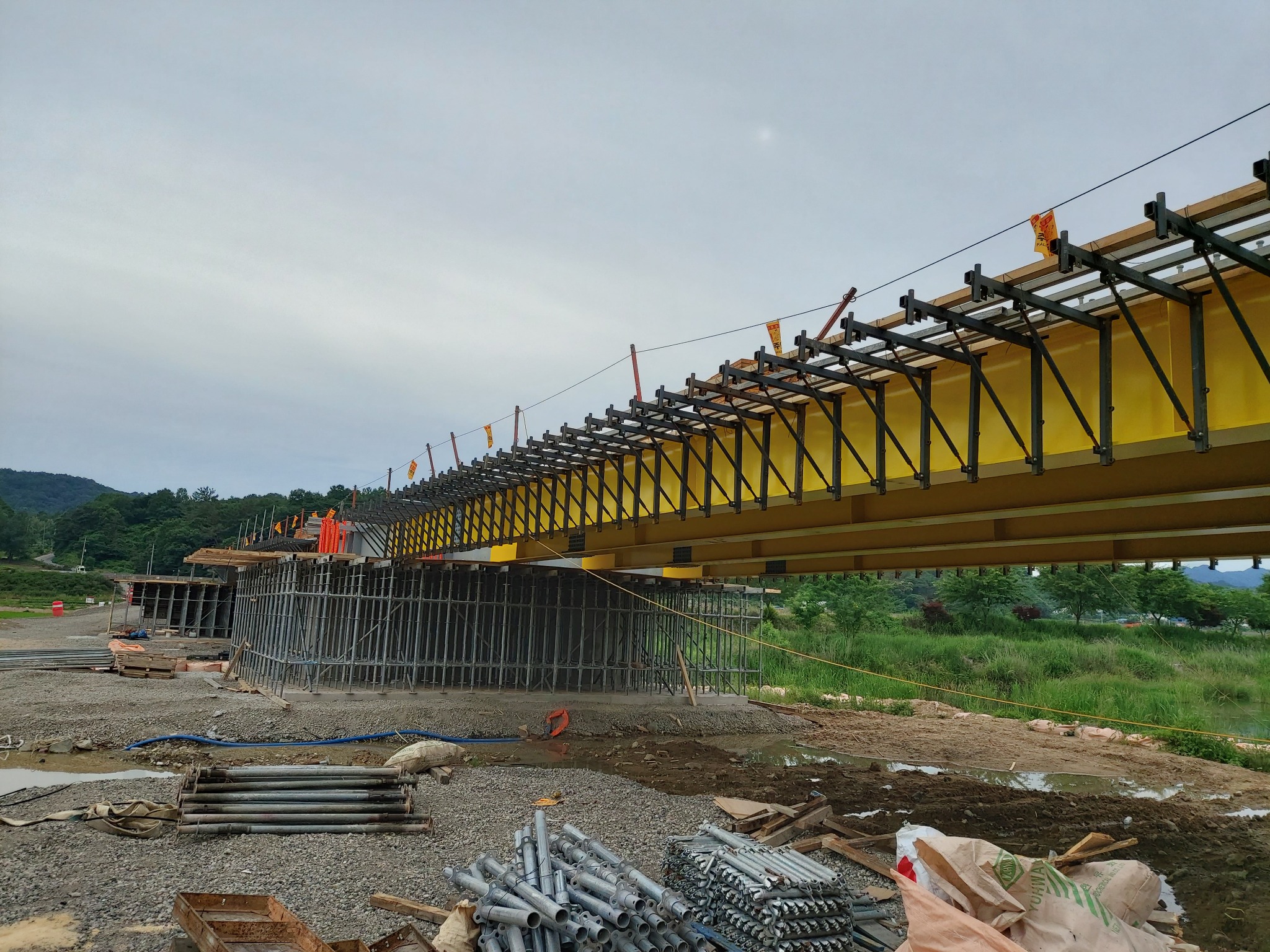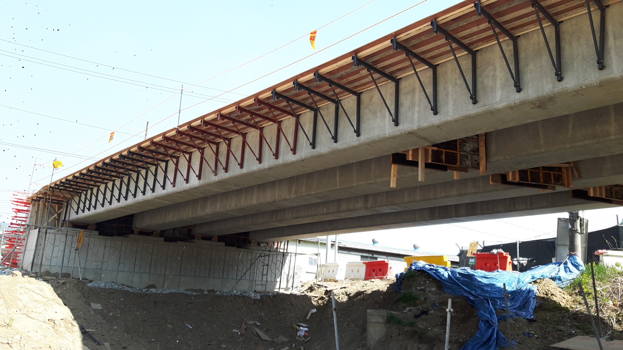 마지막 거더에는 한쪽 지지밖에 불가능하므로 삼각형 구조의 까치발로 외측 슬래브 거푸집을 안정적으로 지지합니다.